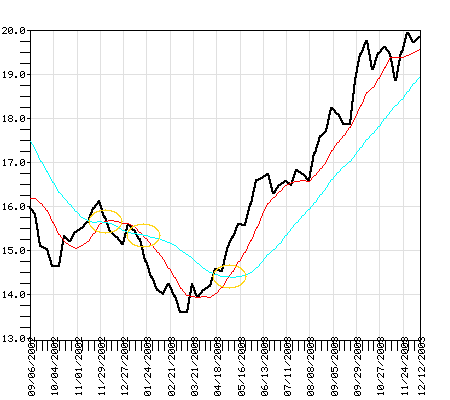 Shown in black is the plot of the closing price of the JAOSX Mutual Fund over the last year. The colored lines indicate two moving averages. Where these lines cross each other indicates a signal to buy or sell. If the trend is down, the red line will cross and be below the green line indicating a sell signal. The same is true when the trend changes to the up side. The red line will cross the green line on the up side and indicate a buy signal.