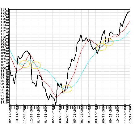Shown in black is the plot of the closing price of the VGHCX Mutual Fund over the last year. The colored lines indicate two moving averages. Where these lines cross each other indicates a signal to buy or sell. If the trend is down, the red line will cross and be below the green line indicating a sell signal. The same is true when the trend changes to the up side. The red line will cross the green line on the up side and indicate a buy signal.